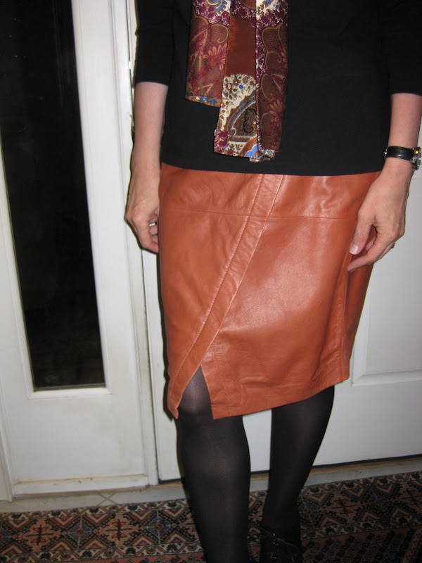 It's the first leather skirt I've ever bought! It's not really a pencil skirt or an a-line skirt--it's sort of in-between and I don't know if that's good. I'm not sure if it's supposed to fit tighter (not sure if the leather will stretch out as I wear it), but it feels very comfortable and it's completely lined. Mark doesn't seem too sure about it. Any opinions?